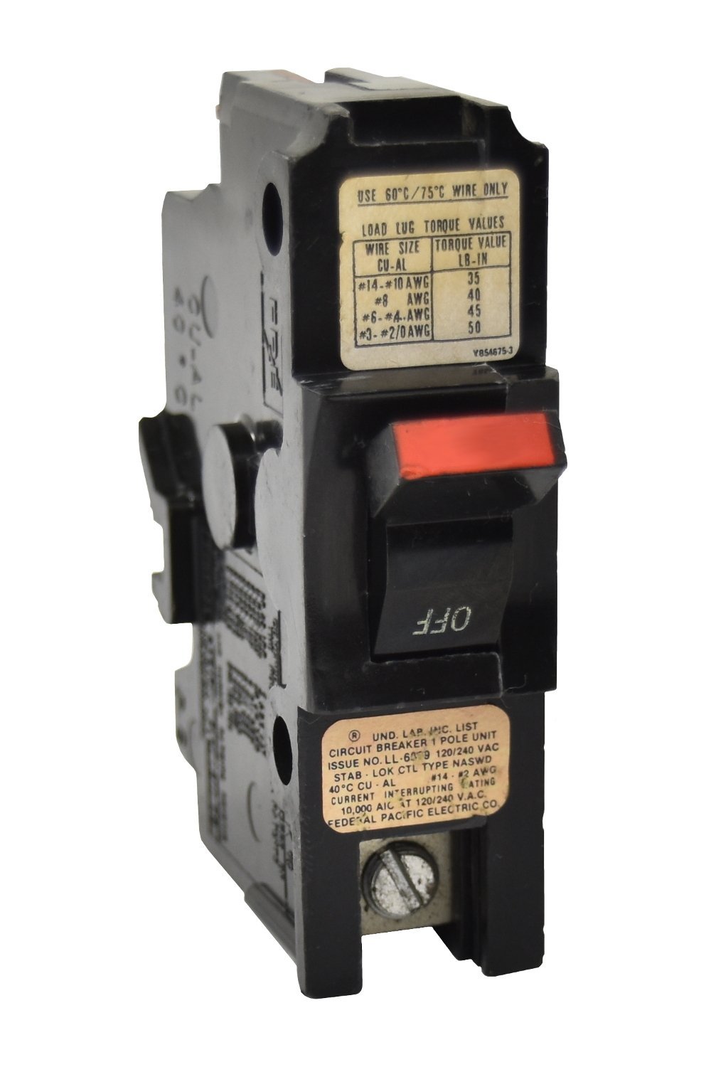 NA15 circuit breaker by Federal Pacific. 15 amps, 10kA@120V AIC Rating, NA type, 120 volts Molded Case Circuit Breaker with Low Price Guarantee. Re-Certified with Warranty.
