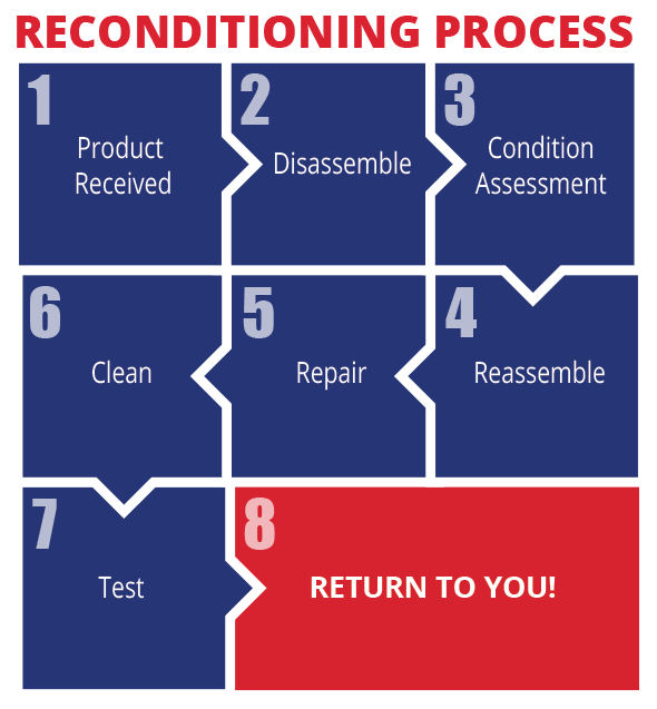 A step-by-step look at how a reconditioned electrical device is repaired, tested and available for reuse.